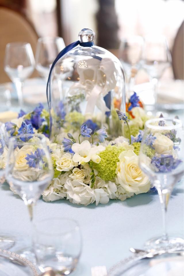 Această frumoasă idee de aranjament flori de botez clopot este personalizata cu mici accesorii din trusoul bebelusului – papucei, jucarii sau orice alt detaliu pe care parintii doresc sa il impartaseasca cu invitatii